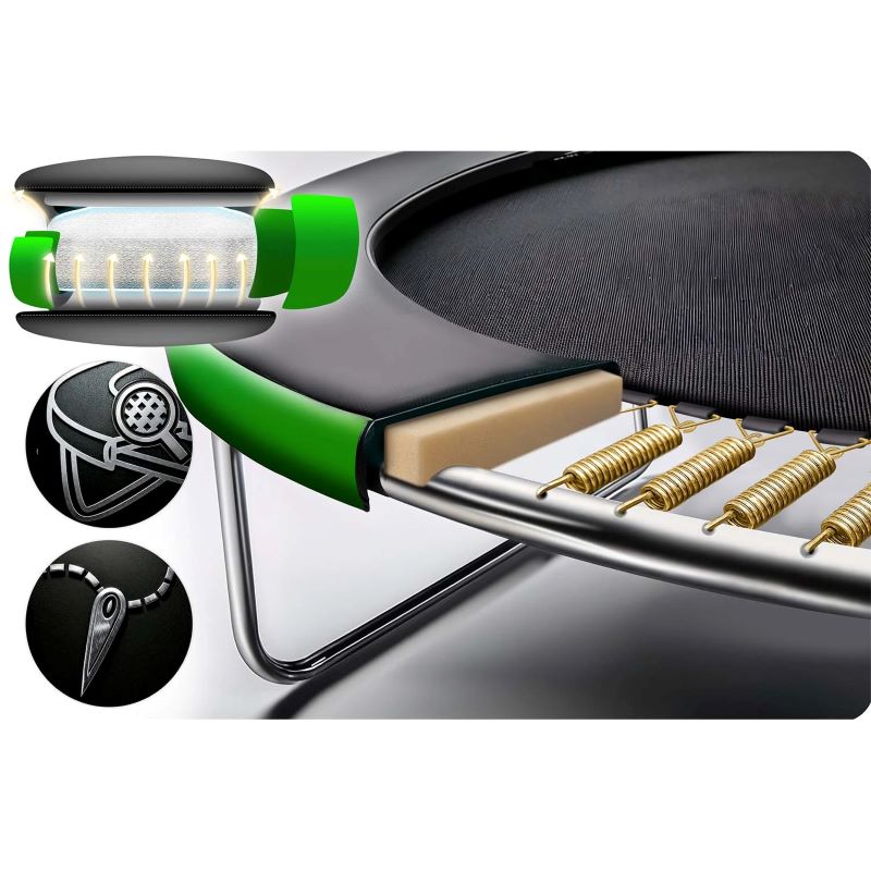 Міцний металевий каркас із оцинкованої сталі стійкий до корозії та витримує значні навантаження. Стрибкове полотно виготовлене з зносостійкого матеріалу, що забезпечує довгий термін служби та відмінну пружність.